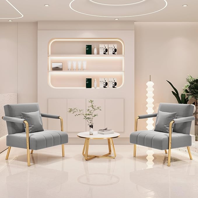 Yaheetech 30" W Accent Chair Velvet Oversized Armchair Living Room Chair with Golden Frame & Cozy Pillow for Living Room, Bedroom, Office Light Gray