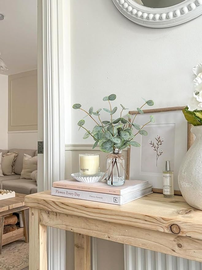 • Ideal Size: Artificial eucalyptus plant stems stand at 13.5 inches tall, paired with a glass vase measuring approximately 5.1×2.55×2.55 inches, making it suitable for any small corner of your home. Whether by the fireplace, on a bookshelf, or by the windowsill, it seamlessly integrates, adding a touch of natural greenery to various spaces.