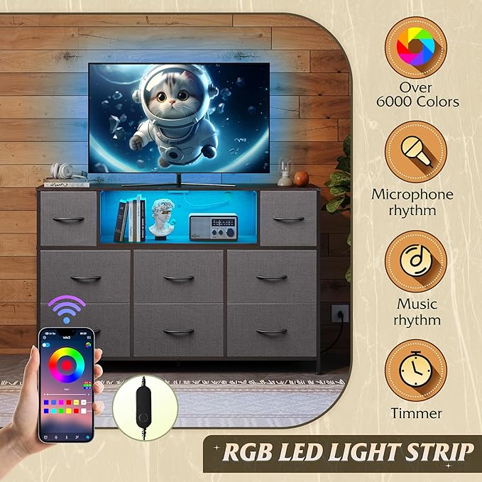 WLIVE Grey Dresser TV Stand for 45, 50, 55 inch TV, Entertainment Center with LED Lights & Charging Station, Chest of Drawers with 8 Fabric Drawers and Open Storage Shelves for Living Room, Hallway