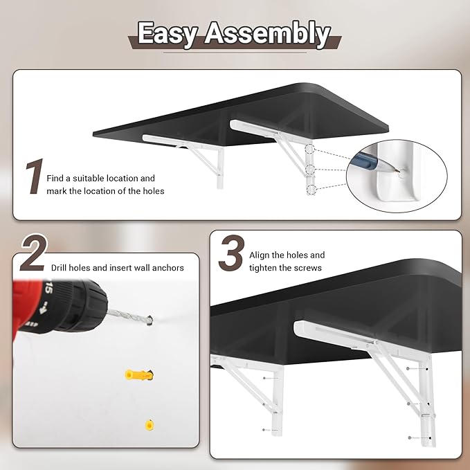 • Easy Assembly: The bracket and table board do not need to be installed, just six screws need to be inserted on wood studs, brick, or concrete wall to obtain a floating desk; Note: No screws compatible with drywall are provided