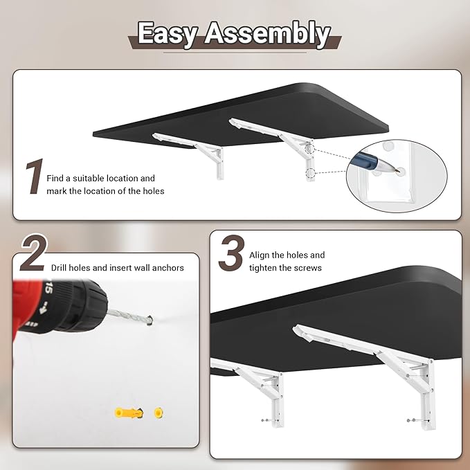 • Easy Assembly: The bracket and table board do not need to be installed, just six screws need to be inserted on wood studs, brick, or concrete wall to obtain a floating desk; Note: No screws compatible with drywall are provided