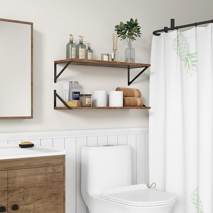 • 【DECORATIVE & FUNCTIONAL】The wall-mounted floating shelves are designed for decoration and storage, utilizing and decorating any space in your home. Used as shelf decor to show your collection, books, or prize, the hanging shelves are perfect for displaying your photo frame, small plants, model, or audio in your living room, office, study. And can also use as over the toilet storage shelf in the bathroom to hold toiletries or used as kitchen shelf to storage condiments.