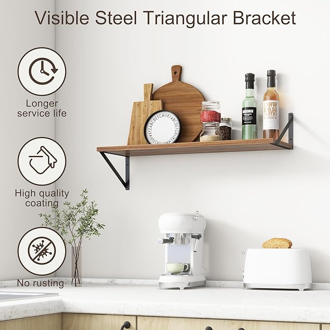 • 【FARMHOUSE RUSTIC WALL SHELF】These floating shelves are made of premium engineered wood board and visible triangular bracket. The rustic wooden grain surface add character and warmth to any modern or traditional interior with these deep floating shelves, contrast shelves at staggering heights on the wall or mount side-by-side or in the corner for a clean streamlined look.