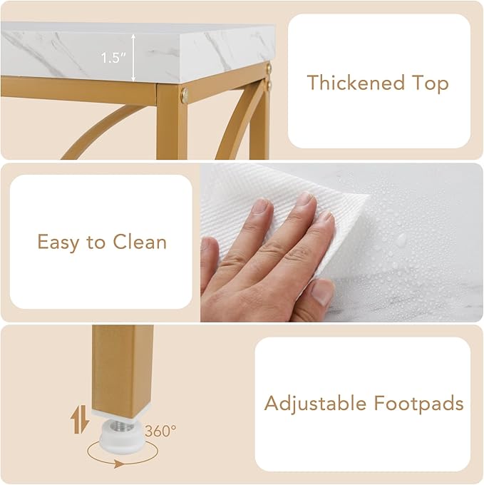 • [Unique Design]: Featuring a sleek geometric frame and an elegant faux marble top, this long sofa table combines modern style with a touch of charm. The powder-coated metal frame ensures long-lasting beauty.