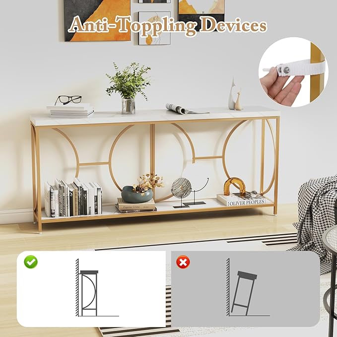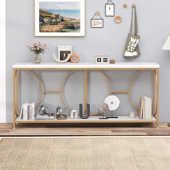 Giantex 71" Console Table, 2-Tier Extra-Long Gold Entryway Table w/Storage Shelf, Faux Marble Top, Narrow Sofa Table with Geometric Frame, Behind Couch Entry Table for Living Room, Hallway, Foyer
