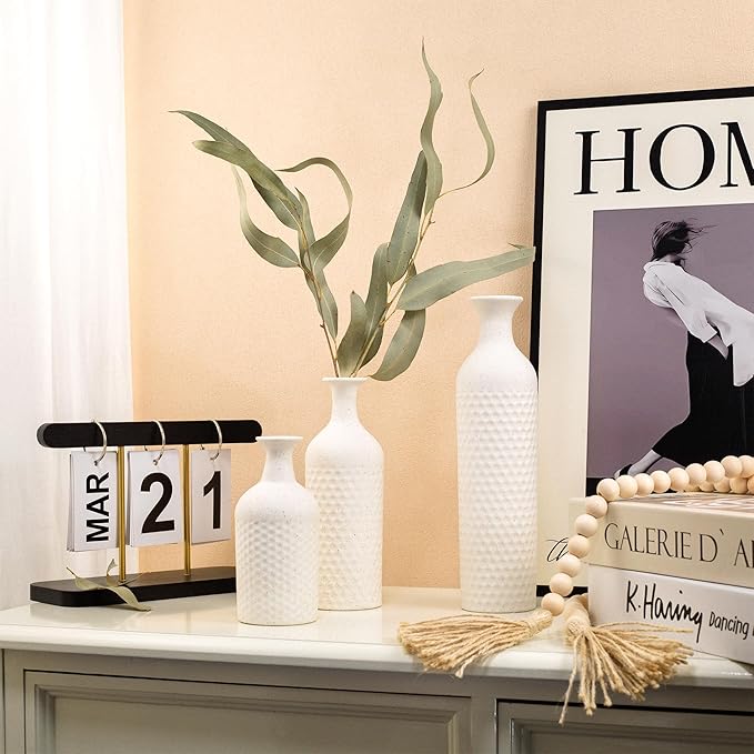 Small White Vases for Home Decor, Decorative Ceramic Vase Set, Matte Finish Honeycomb Texture, Modern Farmhouse Vases for Coffee Table, Bookshelf, Kitchen, Bathroom, Office Desk Decor