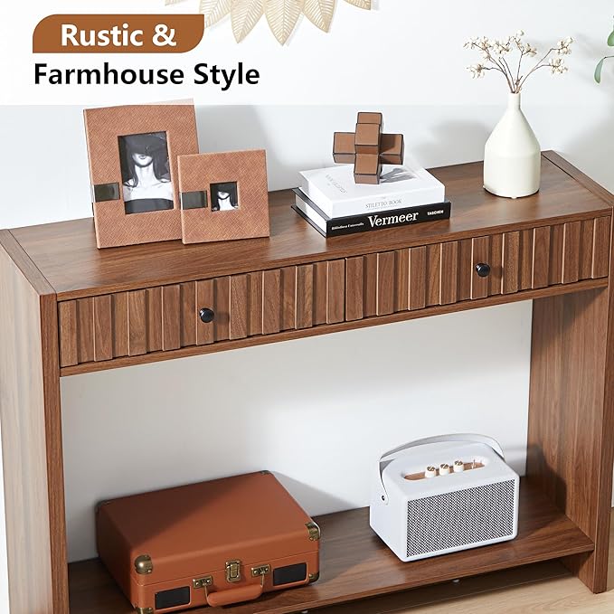 • Elegant Fluted Console Table: The AVZEAR foyer tables for entryway combine classic mid-century aesthetics with modern functionality. Its sleek walnut finish, clean lines, and charming fluted drawers add sophistication. Perfect as a mid century slim console table, narrow entryway table, or hallway accent table, it’s available in walnut and black colors, ensuring a match for various living room furniture styles.