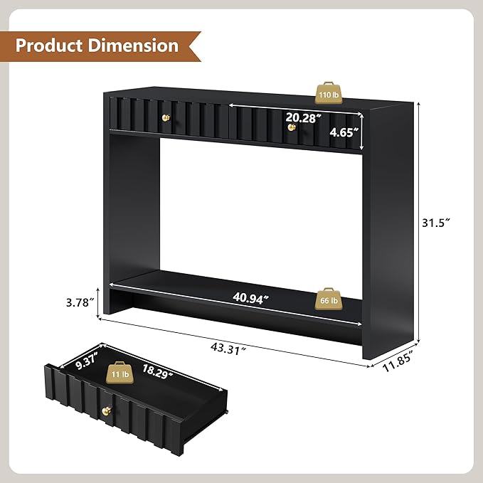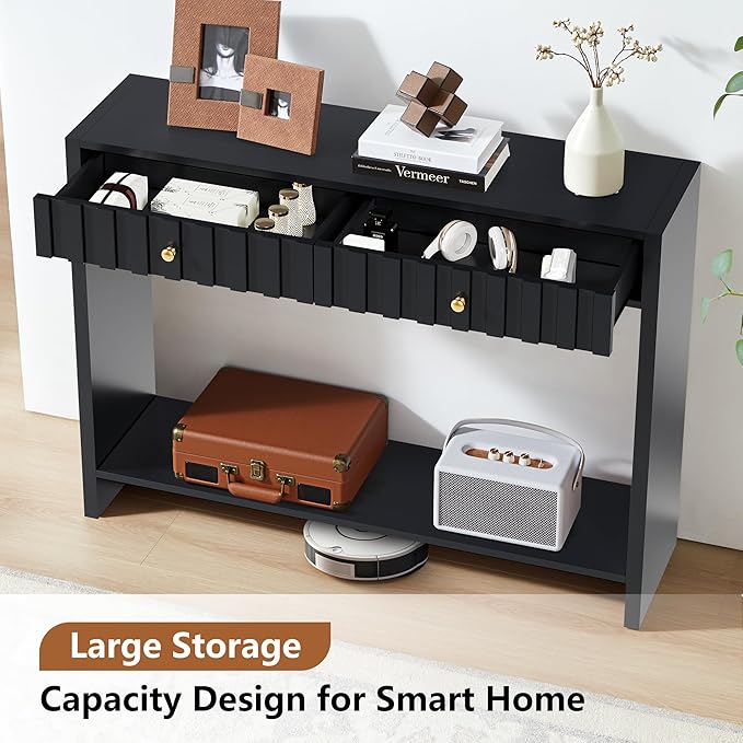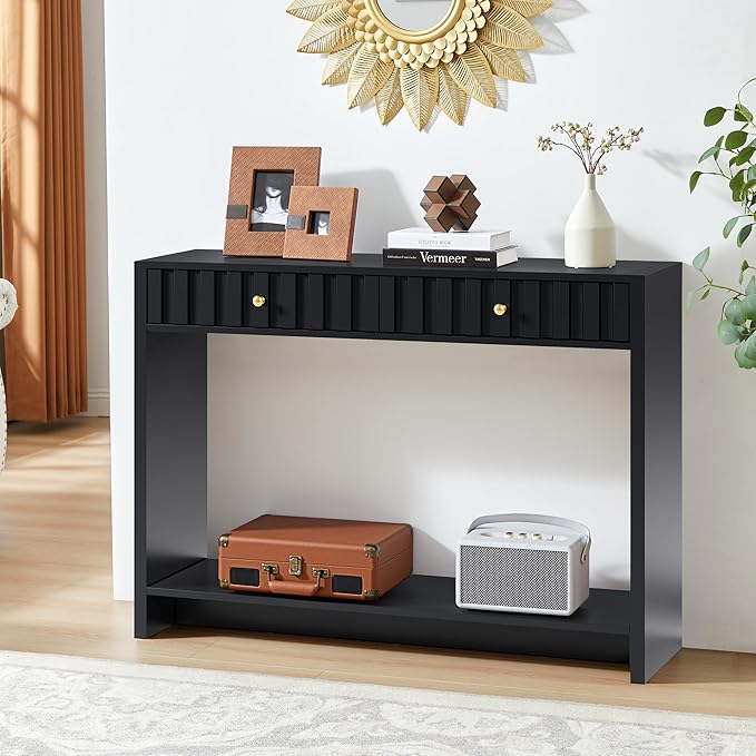 AVZEAR Entryway Console Table with Fluted Drawers, Mid Century Entryway Table with Storage, 43" Long Couch Table Behind Sofa Narrow Sofa Table Console Tables for Living Room Hallway Entrance, Black