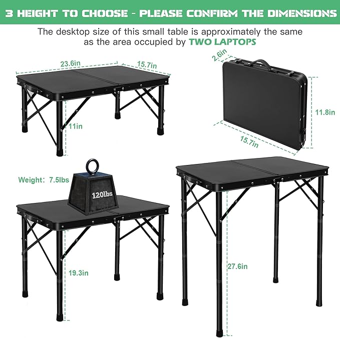 • Size Note: This table is smaller than standard-sized tables. Table dimensions: 23”length×15”width×27”height. We recommend watching our live video to confirm the actual dimensions before purchasing. Folds to 15.8" x 11.8" x 2.6", making it easy to carry and store. Care & Usage:Avoid placing objects >120 lbs or applying concentrated pressure to prevent damage.