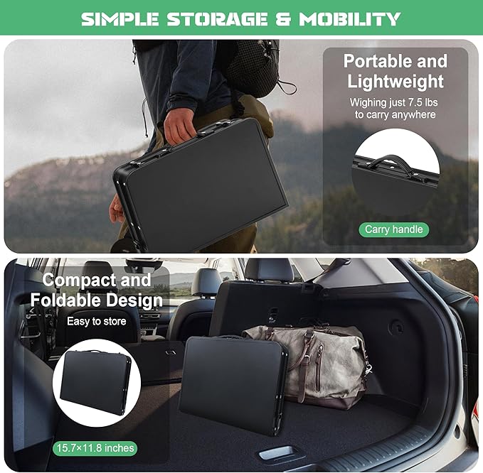 • STURDY & STABLE This outdoor folding table is built with reinforced triangular supports, a durable metal tabletop, and 4 secure latches for unbeatable stability. Unlike other tables with weak plastic joints, ours features all-metal leg connections for extra strength and long-lasting performance. Lightweight at 7.5 lbs yet supports up to 120 lbs.