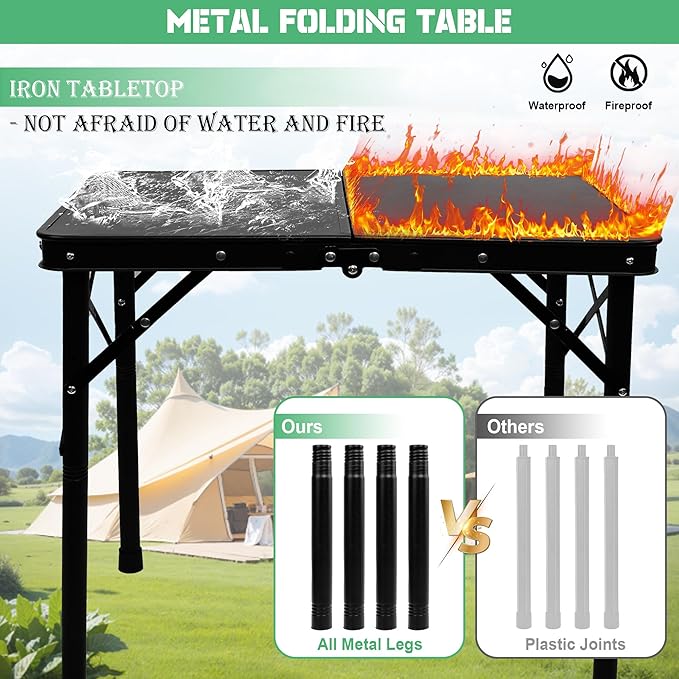 • DURABLE USE Rust-resistant metal surface treated for long-lasting durability in outdoor conditions. It’s waterproof, heat-resistant (perfect for placing grills or BBQ tools), and easy to clean—just wipe it down with a damp cloth. Ideal for reliable performance in RVs, patios, beaches, balconies, or gardens, this camping table combines toughness with low-maintenance convenience.