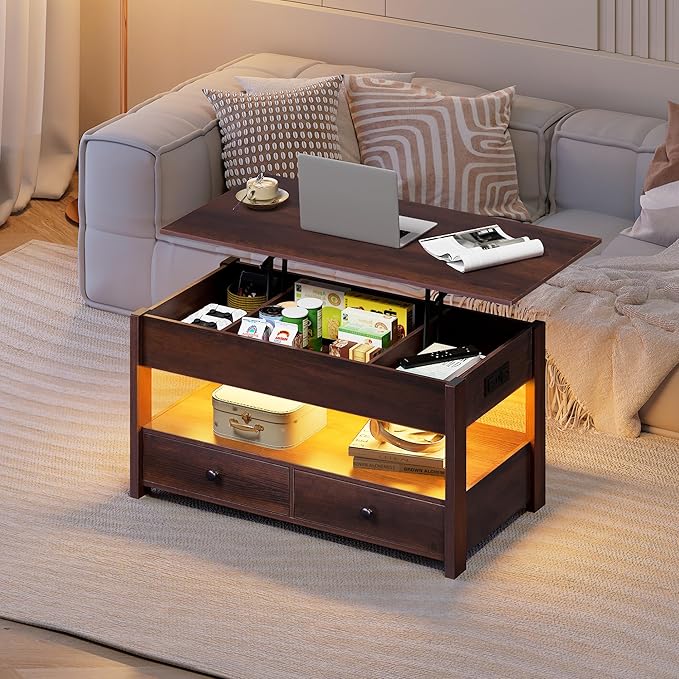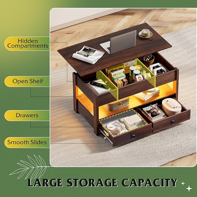 WLIVE Coffee Table, Lift Top Coffee Table with 2 Drawers, LED Light, Large Hidden Compartment and Open Shelf, Lift Tabletop, Dining Table for Living Room, Espresso