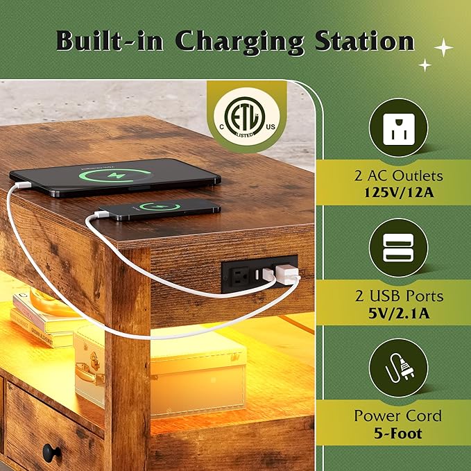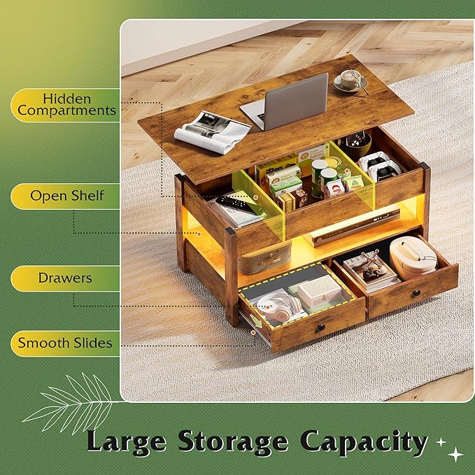 WLIVE Coffee Table, Lift Top Coffee Table with 2 Drawers, LED Light, Large Hidden Compartment and Open Shelf, Lift Tabletop, Dining Table for Living Room, Rustic Brown