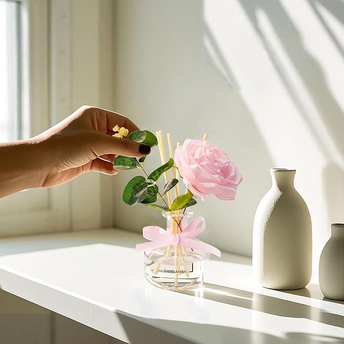 • Complete Reed Diffuser Set Includes: (1) 7.1oz (210ml) natural fragrance concentrates (210ml); (2) simple but unique design glass bottle; (3) an artificial rose; (4) a simulated eucalyptus; (5) 7 reed diffuser sticks; (6) an adjustable satin ribbon. Everything needed for stylish home fragrance decor.