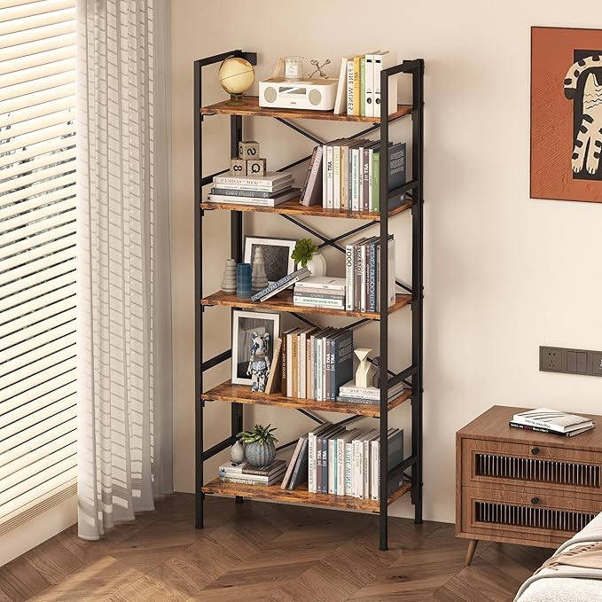 Folding Bookshelf,5 Tier Bookcase Foldable Shelf with X-Bracket Design, Adjustable Feet, Space Saving Storage for Living Room, Office, Rustic Brown