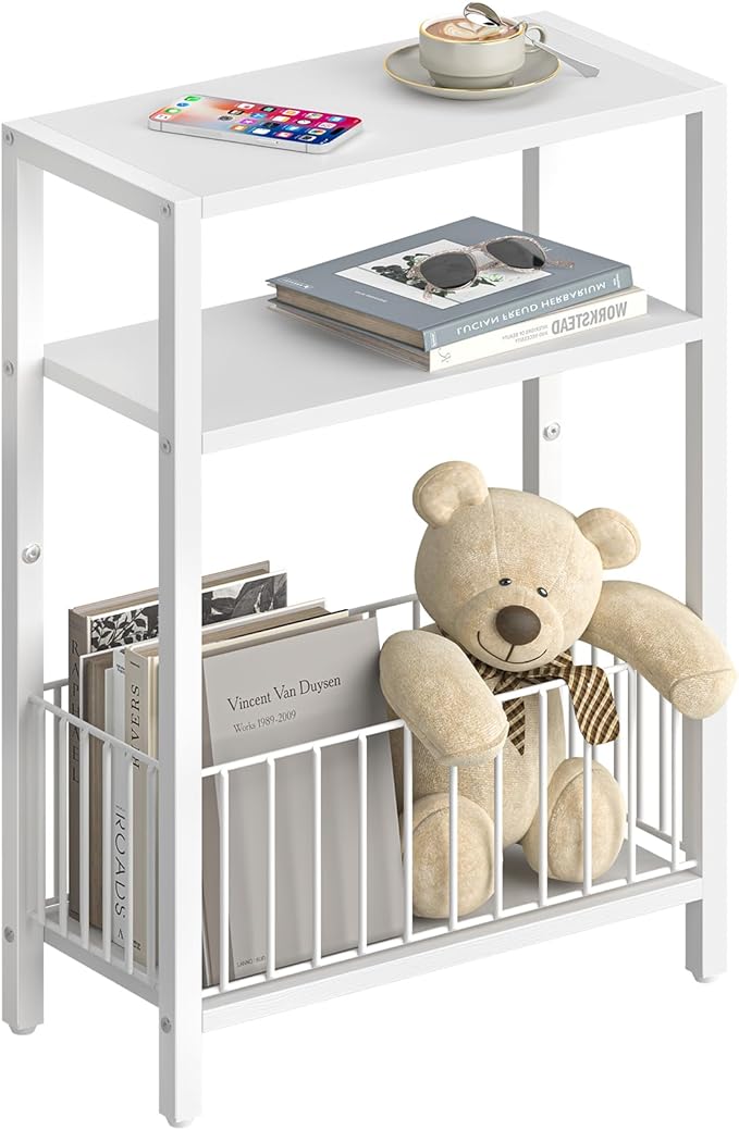 Yoobure Narrow Side Table with Storage Basket, Small End Table for Small Spaces, Skinny Side Tables Living Room Bedroom Office, Slim Nightstand 3 Tier Bedside Table Space-Saving for Magazine, White