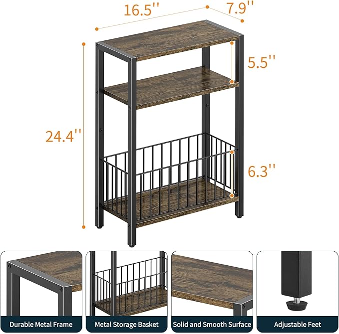 Yoobure Narrow Side Table with Storage Basket, Small End Table for Small Spaces Skinny Side Tables Living Room Bedroom, Slim Nightstand 3 Tier Bedside Table Space-Saving for Magazine, Rustic Brown