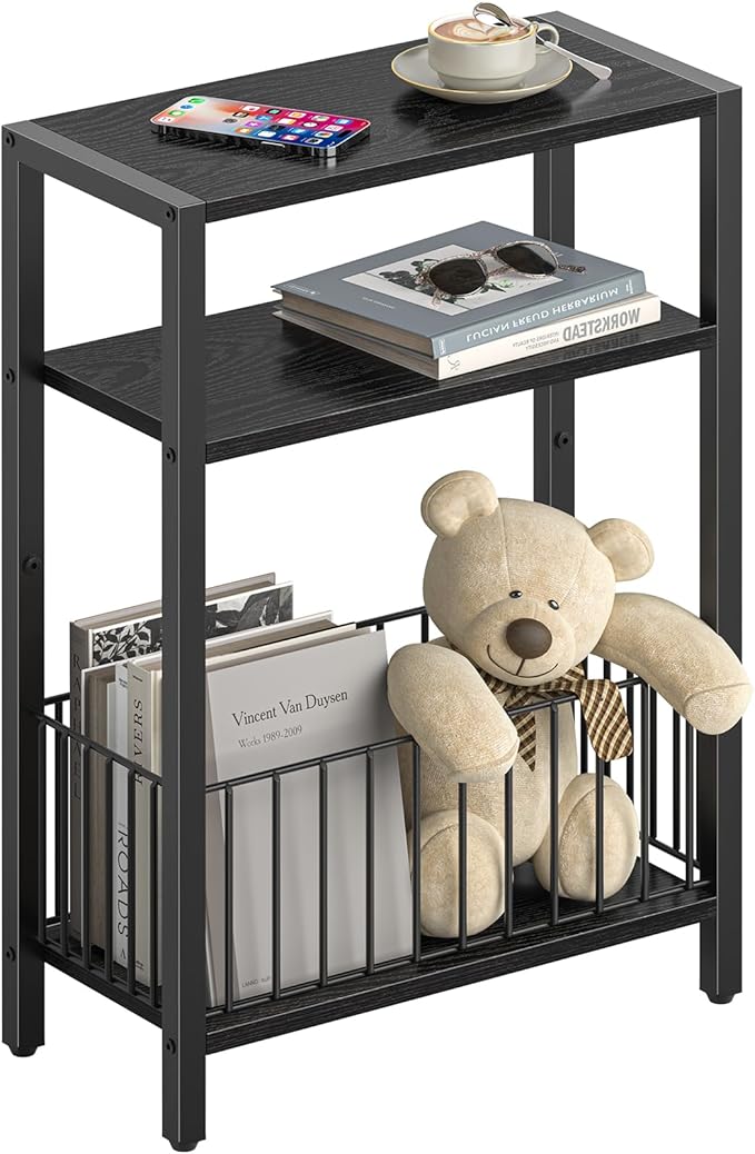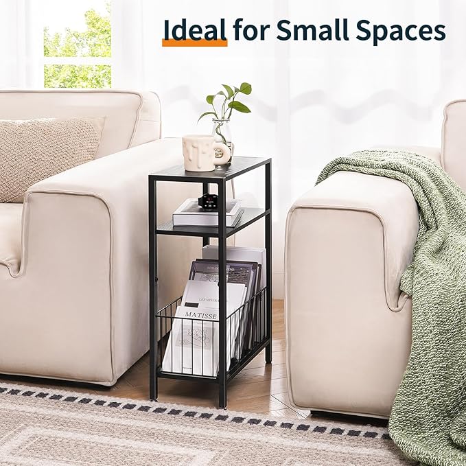 Yoobure Narrow Side Table with Storage Basket, Small End Table for Small Spaces, Skinny Side Tables Living Room Bedroom Office, Slim Nightstand 3 Tier Bedside Table Space-Saving for Magazine, Black