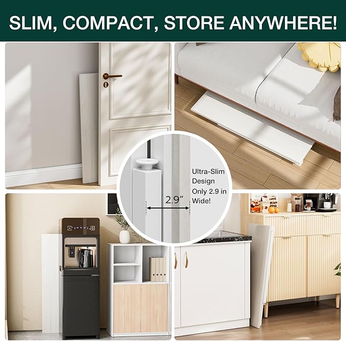 • 👍𝗙𝗢𝗟𝗗𝗦 𝗙𝗟𝗔𝗧 𝗪𝗜𝗧𝗛 𝗦𝗣𝗔𝗖𝗘-𝗦𝗔𝗩𝗜𝗡𝗚 𝗦𝗧𝗢𝗥𝗔𝗚𝗘 — With a folded thickness of only 2.9 inches, this desk fits easily under beds or behind doors. Lightweight and compact, it’s perfect for small-space living or temporary setups like trade shows and pop-up workstations