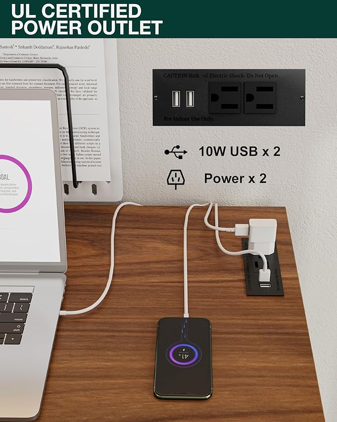 • 👍𝗜𝗡𝗧𝗘𝗚𝗥𝗔𝗧𝗘𝗗 𝗣𝗢𝗪𝗘𝗥 𝗛𝗨𝗕 – 𝗖𝗛𝗔𝗥𝗚𝗘 𝗘𝗩𝗘𝗥𝗬𝗧𝗛𝗜𝗡𝗚 𝗔𝗧 𝗢𝗡𝗖𝗘 — Stay powered and productive with 2 built-in AC outlets and 2 USB ports—perfect for laptops, phones, tablets, and more. No more messy extension cords or reaching for distant plugs; this smart design keeps all your devices charged and your workspace neat