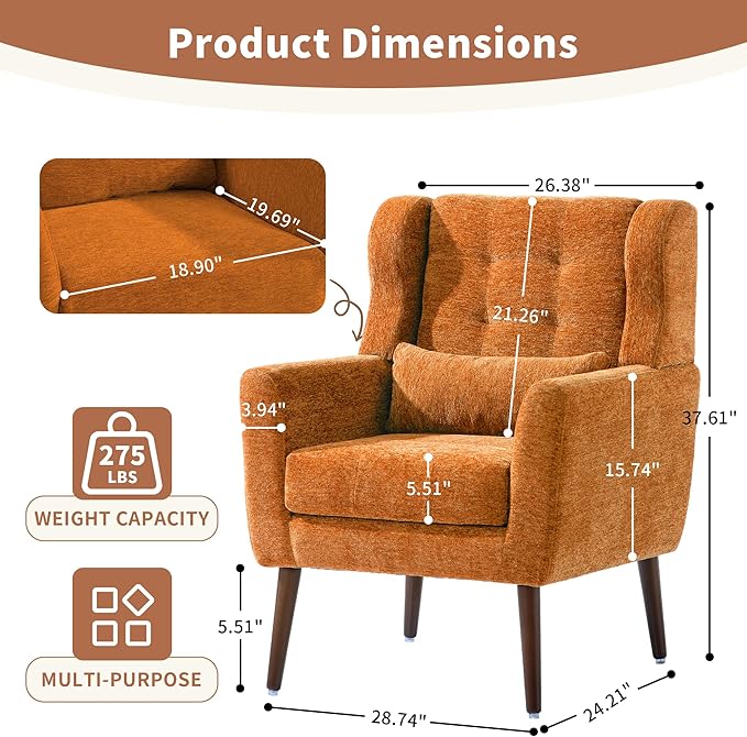 • Lumbar Pillow Support: The Mid Century Modern Accent Chair is made of comfortable and breathable chenille fabric, and the built-in lumbar cushion provides excellent support for your back. Allow your body to fully relax while working, reading, or watching TV