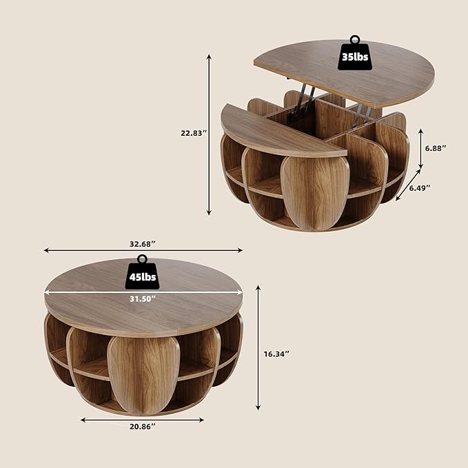 • 【Large Storage Space】 This round coffee table has a large hidden storage compartment under the lifting platform, which is spacious enough to store blankets, books, toys, snacks and any items that need to be hidden or stored, keeping them away from dust and keeping your living room tidy and clean. And multi open compartments beneath the tabletop are enough to store items like books, game controllers, keeping them handy. In addition , the top surface space of 32.7" x 32.7" is spacious enough to display decorative ornaments, vases, laptops, etc