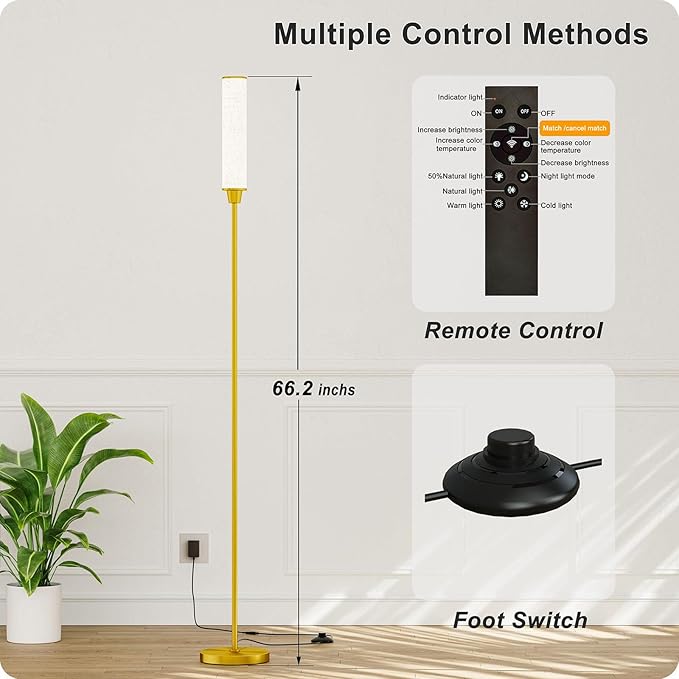 • Smart Remote Control and Foot Switch:With the remote control, you can easily control the corner floor lamp without leaving the sofa and warm bed (with a 32.8ft/10m range).Just press a button, get the right brightness and color temperature for reading, working, leisure, breastfeeding and sleeping.The foot switch allows you to switch the led floor lamp on and off without using your hands, just step on it with your foot.