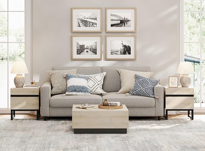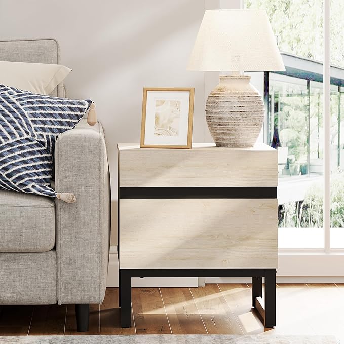 WAMPAT 2 Pack Modern End Table with 2 Drawers, Farmhouse Sofa Table with Black Square Iron Leg, Wood Rustic Side End Table for Living Room, Nighstand for Bedroom, Light Oak