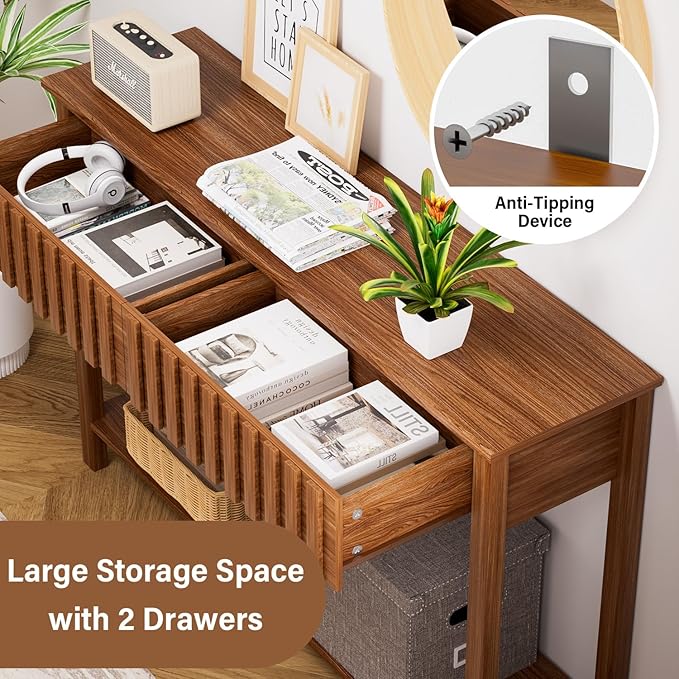 • Ample Storage Space: With two spacious fluted drawers and an open bottom shelf, this console table with storage offers plenty of room to keep your essentials tidy. Use the drawers for personal items and the shelf for decorative accents or storage baskets, making it perfect for living room tables or any entryway