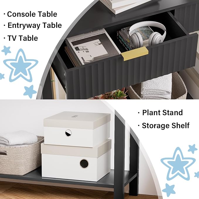 • Ample Storage Options: With spacious fluted drawers and an open bottom shelf, this console table with storage is ideal for keeping your essentials organized. Whether it’s decorative items or storage baskets, you’ll have plenty of room to display and store your treasures