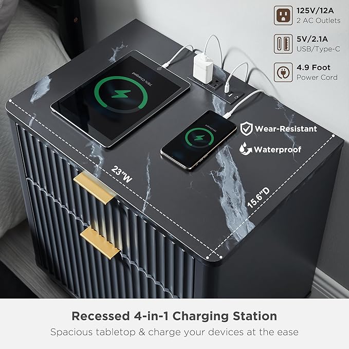 T4TREAM 23'' Fluted Nightstand Set of 2 with Charging Station, Large 2 Drawer Bedside Table, Modern End Table with Storage, Mid Century Night Stand for Bedroom Living Room, Curved Profile, Dark Grey