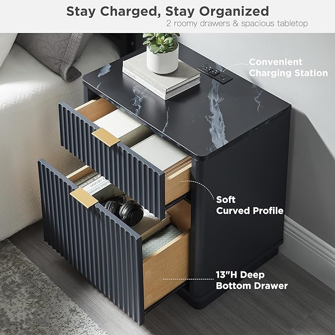 • Modern & Functional Style – Featuring a sleek, curved profile and 2 sliding drawers with a distinctive fluted wave pattern, this nightstand combines minimalist style with practical functionality. Its chic design blends seamlessly with various bedroom aesthetics, from contemporary to mid-century modern, while the rounded edges ensure safety for kids and families.