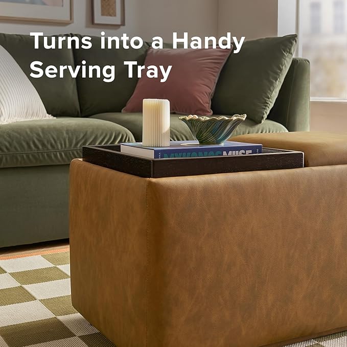 mopio Levi Storage Bench with Reversible Tray, Modern Storage Coffee Table, Bedroom Bench, Rectangular Cube Upholstered Coffee Table Ottoman for Living Room, Bedroom (Faux Leather, Pecan Brown)