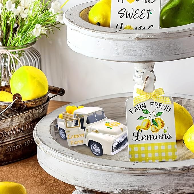 • Upgraded Lemon Truck Decor: This 2025 Lemon Farmhouse Truck Decor Set includes a metal truck, 1 mini wood crate and 10 mini faux lemons. Vintage and rustic look, perfect for farmhouse summer decorations for home. Lemon kitchen decor and accessories not only conveys a happy mood, but also brings more vibrancy to your spring and summer home