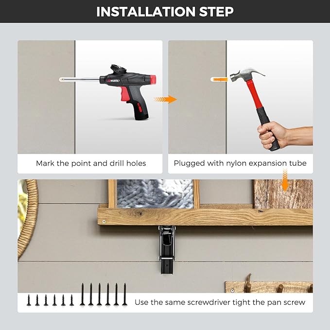 • Easy Installation with Complete Kit: Includes 2 shelf brackets, 6 short screws, 6 long screws, and 6 expansion anchors—everything you need for a quick and hassle-free setup. Simply ensure the brackets are parallel and perpendicular to the wall