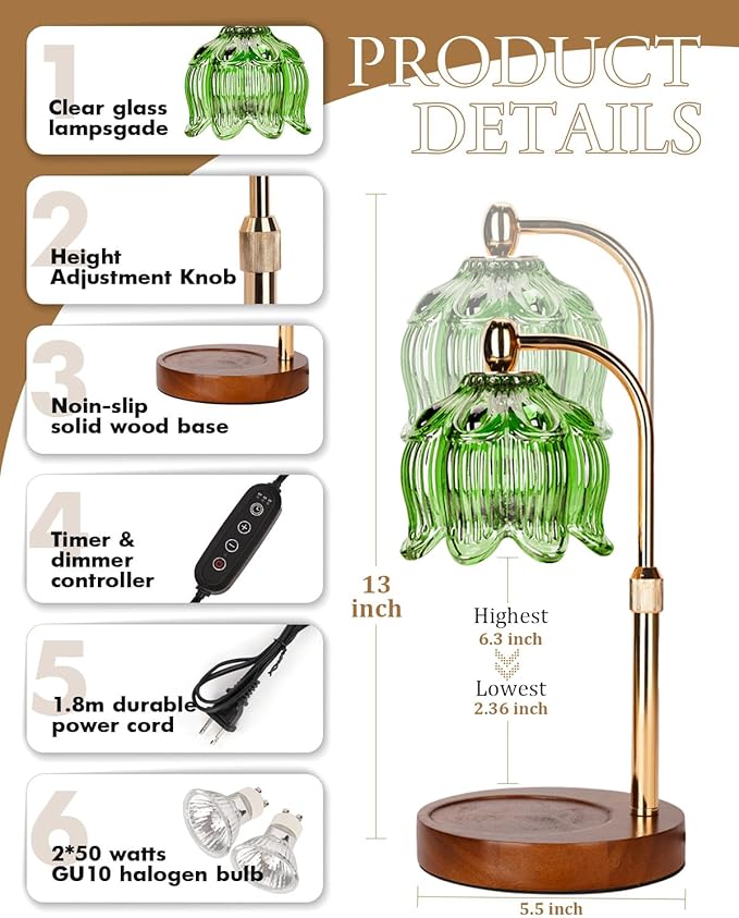 • Safety : Safely wax melts without burning candles, allowing reuse of wax and extended candle life, Uses 2x 50W bulbs (included) to melt candles without smoke, or soot, perfect for homes with kids pets and ideal for offices, bedrooms, or any space where safety matters