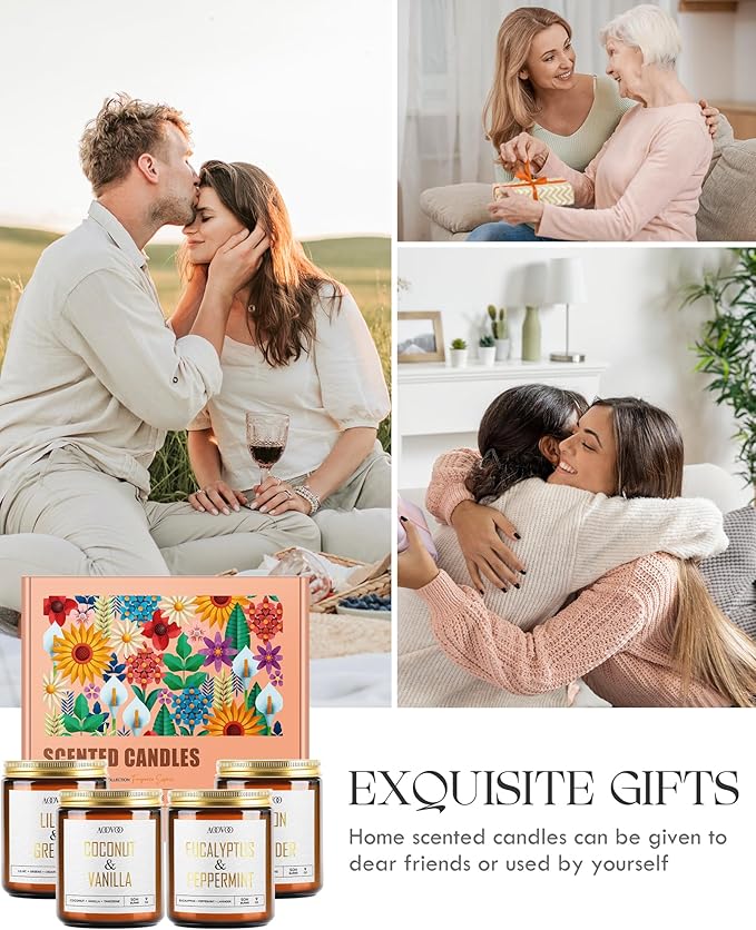 • Perfect for Gifting: No extra wrapping needed. Presented in an elegant gift box with beautifully crafted glass jar candles and gold foil labels, boasting an array of delightful scents that make this gift truly special.