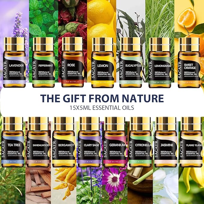 SACATR 500ml Essential Oil Diffuser with 15 Essential Oils, Ultrasonic Cool Mist Humidifier, Remote Control, 4 Timers, 15 Color Lights, Auto Shut-Off