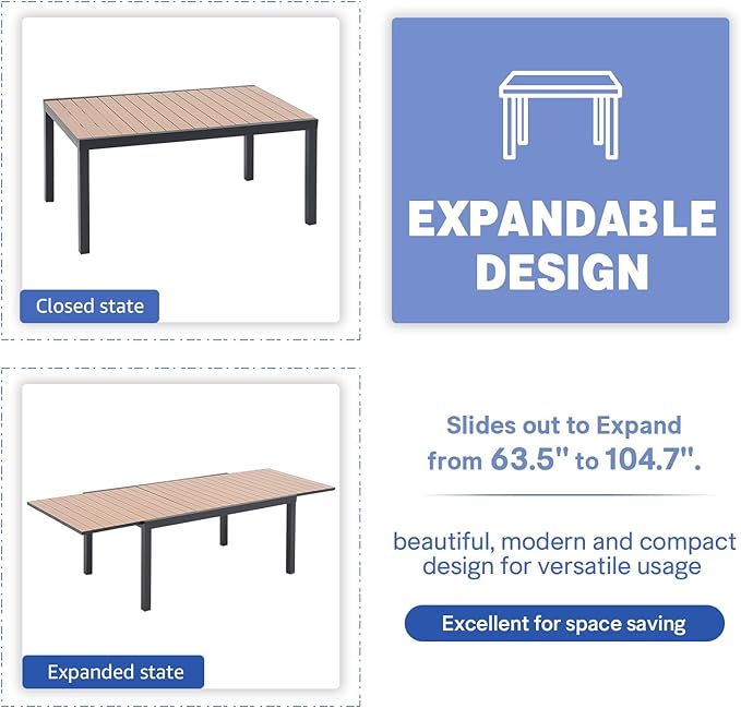 • 【MODERN DESIGN & ELEGANT APPEARANCE】: With clean-cut lines, our expandable patio table is the ideal modern accessory for your indoor/outdoor space. Finished with smooth aluminum legs and a slatted design, this outdoor table not only offers a chic, minimalistic look but also provides a stable structure.