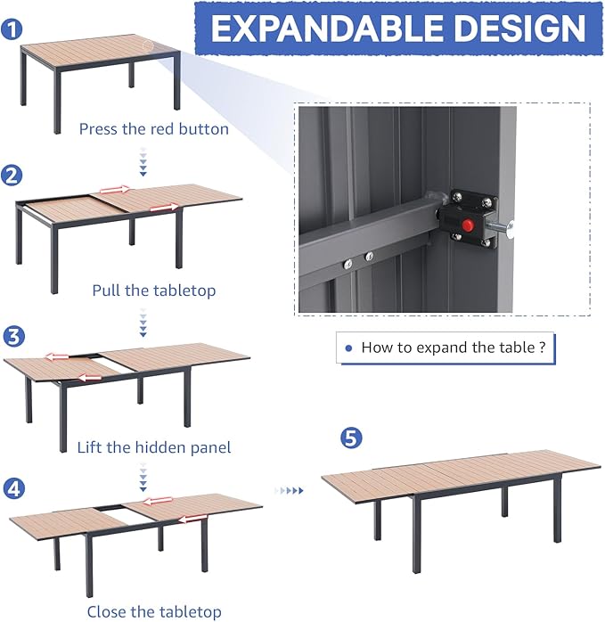 • 【WIDE APPLICATION】: With its extension design and quality aluminum, the extendable outdoor dining table conveniently expands to make it easy for you to add extra seats when needed. Perfect for hosting, either using the expandable table as your main dining table or as a serving table for larger events.