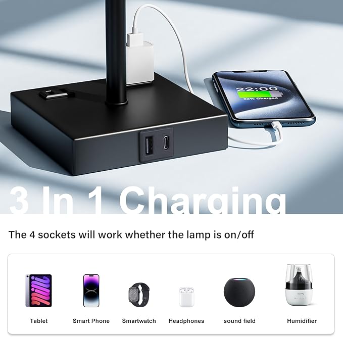 • 2. USB A & C and AC Outlet for Charging - Power 8 devices at once bed side lamps set! With 2 usb-c ports (5V/2.1A) and 2 usb-a ports (5V/2.1A) and 4 outlets (120v) on the nightstand lamps set of 2, stay connected whether the desk lamp is on/off, whether you're winding down with a tablet in hand or need to recharge your smartphone while working at your desk. With instant access to power, your devices are always within reach whenever you need them.