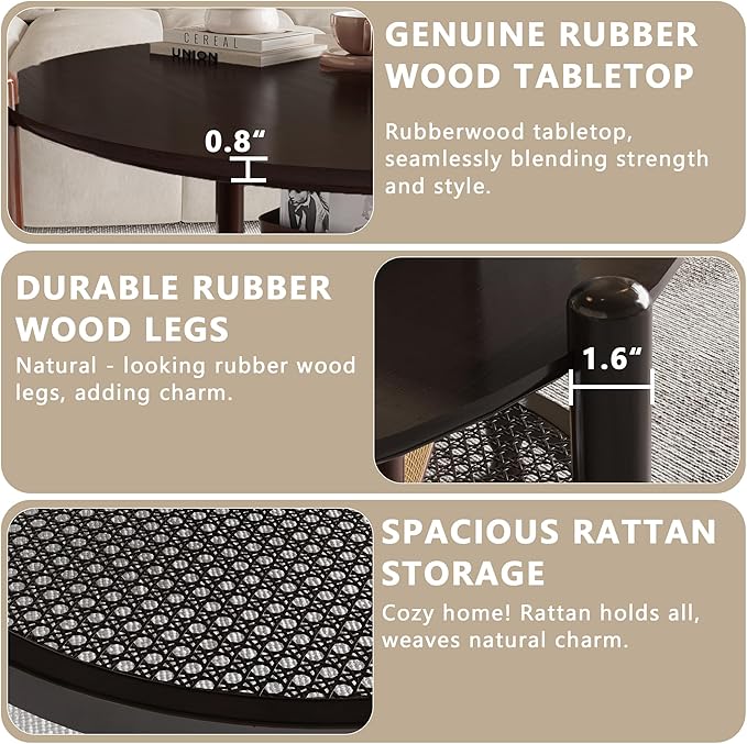 NSdirect Round End Table for Living Room, 2-Tier Rustic Wood Center Table for Home Decor with Boho Woven Rattan Storage Shelf | Modern Farmhouse Design, Easy Assembly, Black Brown