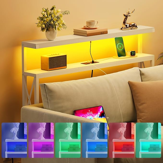 FAVOOSTY 46.8" Skinny Console Table with Charging Station and LED Light,5.9" Narrow Sofa Table with Power Outlets and Type C & USB Port, Behind Couch Table for Living Room, Hallway, EntryWay, White