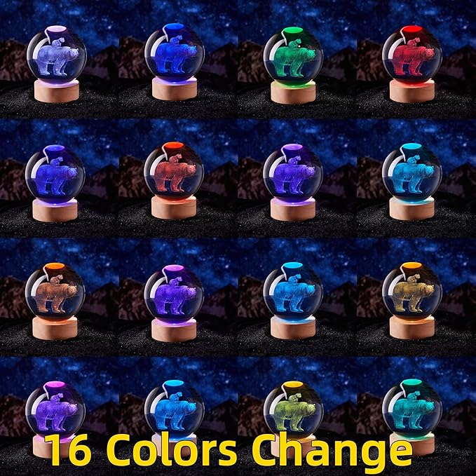 • ▶【16 Colors Change & Multiple Lighting Modes】Our 3D Polar bear Crystal Ball Lamp have 16 colors and 4 modes. You can use the remote control to choose the color of your favorite lights and adjust the intensity of the lights.Flash, strobe, fade and smooth four modes,can also always light a color, soft and not glare, protect your eyes.