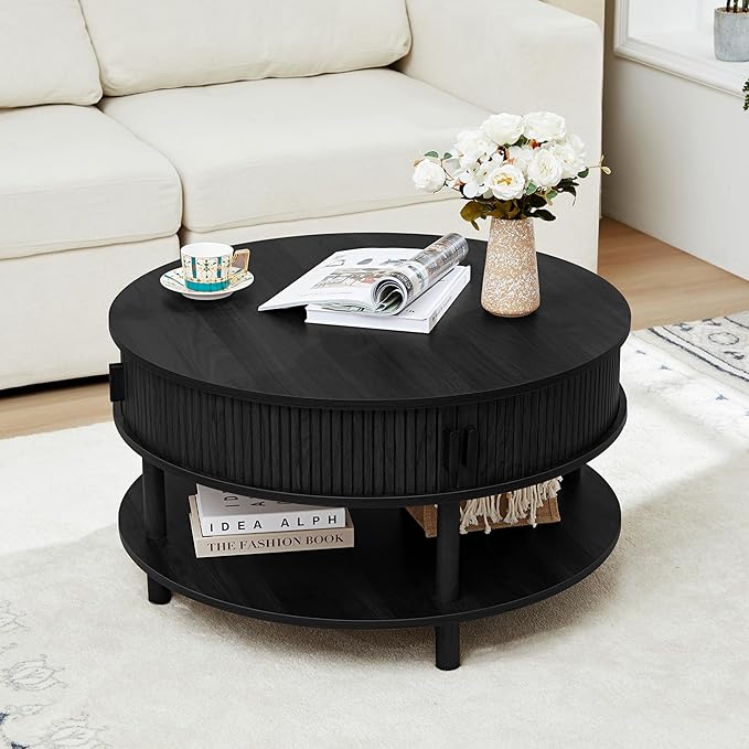 RARZOE 31.5" Round Coffee Table with Storage, Wood Circle Coffee Table with Sliding Cabinet Doors, Fluted Dining Table Accent Center Table for Living Room Home Office Apartment, Black