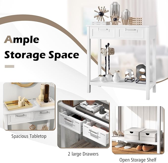 • 【Space-saving Foyer Table with Storage】Overall dimensions of the entryway table: 31.5" x 14" x 32" (W x D x H). This small entryway table features a tabletop, a bottom shelf and 2 drawers, which can provide plenty of storage or collection space to meet your storage or display needs.