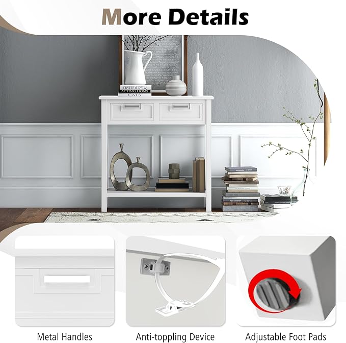 • 【Elegant Style & User-friendly Details】This hallway table features a classic style design. The exquisite metal handles and pattern on the drawers adds elegance to the table. It's designed with an anti-toppling device and adjustable foot pads. All these details aim to form an elegant and safe console table.