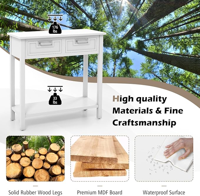 • 【Stable Structure & Rubber Wood Legs】Made of solid rubber wood and high quality MDF, this narrow console table has a stable structure. Weight Capacity: 176 lbs for Tabletop; 44 lbs for Drawer; 33 lbs for Shelf. The surface is smooth and waterproof. Premium materials and delicate finish make this small console table sturdy enough to last for years.