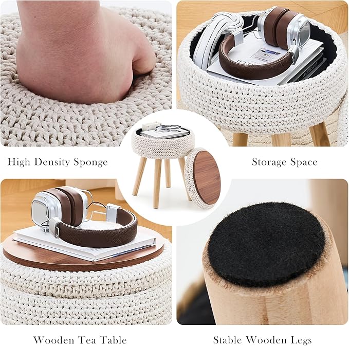 • 【Multi-Functional Footstool Ottoman】 This knitted cotton ottoman is more than just a footrest; it also serves as a stylish vanity chair and a comfortable padded seat. The top cover flips over to reveal a small table, perfect for holding your coffee or desserts while you relax. Perfect for enhancing both function and aesthetics in any space.