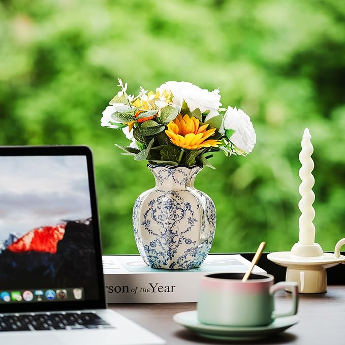 Blue and White Vase, Vintage Blue Ceramic Flower Vessel,Ceramic vases for Home Decor,Vintage Green and Beige for Console Table Mantle Chinoiserie Decor (Blue and White-01, Small)